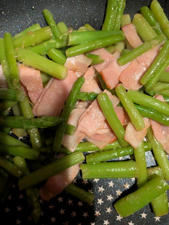 わたし、アスパラが好きです朝食に、アスパラとベーコンのバ…